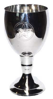 Appearing almost as though a traditional, wooden cup had been transformed to silver, this goblet features the mystical symbol of a pentagram on both its front and back. 5 3/4" x 3"
