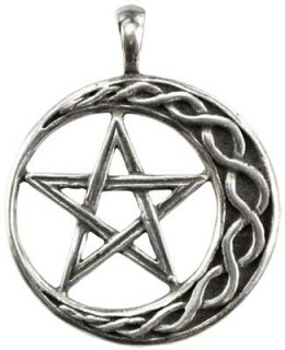 Wear this amulet of a braided crescent moon and interwoven pentagram, to find strength and stability within you and without. Made in USA. Has cord. Pewter. 1 1/4