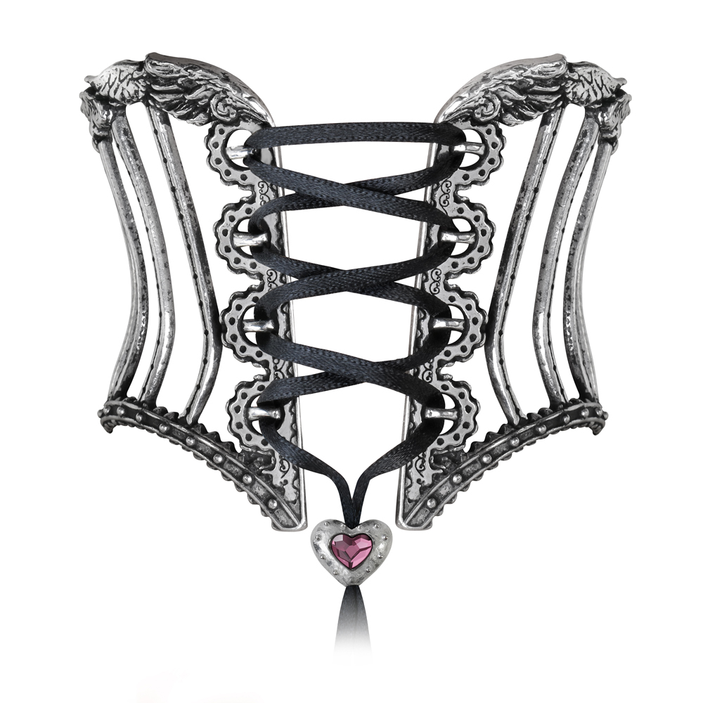 Provocative waist cinching, from elegant Victorian high fashion to goth and fetish chic, applied now to the sensual wrist.A pewter bracelet made in two halves, fashioned as a fancy, Victorian boned corset laced together at the back with a black elastic and tightened and adjusted at the front with black satin ribbon with a purple crystal heart slide fastener.Approximate Dimensions: Width 3" x Height 2.3" x Depth 2.2"