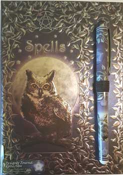 This beautifully embossed Spells with pen journal, is designed with metallic paper that pops detail of its artwork, by renowned artist, Luna Lakota. The front cover is artwork is an owl with full moon, surrounded by leafed vine, with pentacle on top and bottom of perched "Spells" owl. This set includes a standard ballpoint pen, that has printed artwork matching the design of the book, with a small elastic matching wrap penholder on front edge of its cover, to keep the set respectively together. There is also a nicely attached soft silk book page marker that extends beyond the bottom of its pages. 5" x 7" - 160 unlined pages of sustainable acid free forest paper. Artwork by renowned artist, Luna Lakota.