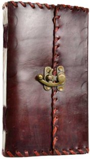 Hand tooled blank leather journal with unadorned cover and hand stitched edging. Sizes vary slightly. Leather, handmade paper. 240 pages, latch closure. 5 1/2 x 9, (made from goat leather).