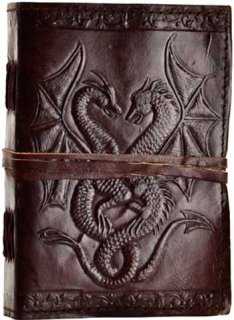 Hand tooled blank leather journal with embossed double dragons. Each is unique. Border embossing may vary. Sizes and leather shades vary slightly. Leather, handmade paper. 240 pages, cord closure. 5