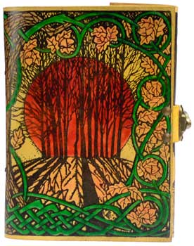 Hand tooled blank leather journal embossed and hand painted with imagery and symbols of the Solstice. Leather, handmade paper. 144 pages, latch closure. 5" x 7". Made in USA.