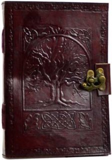 Hand tooled blank leather journal with an embossed Tree of Life and Celtic knot work on both covers. Border embossing may vary. Sizes vary slightly. Leather, handmade paper. 280 pages, latch closure. 7