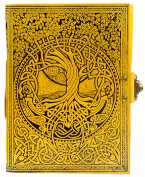 Hand tooled blank leather journal with embossed covers featuring the Tree of Life and the River of Knowledge. Border embossing may vary. Sizes vary slightly. Leather, handmade paper. 280 pages, latch closure. 5